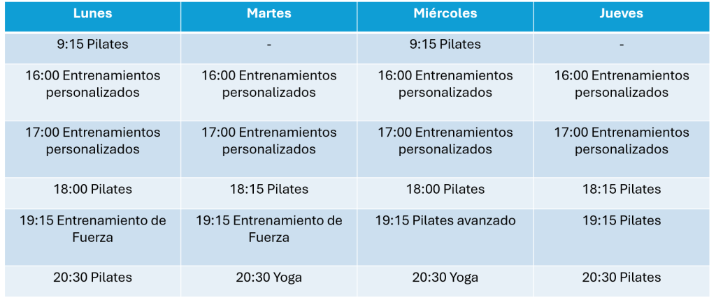 Horarios de actividades dirigidas y entrenamiento personal